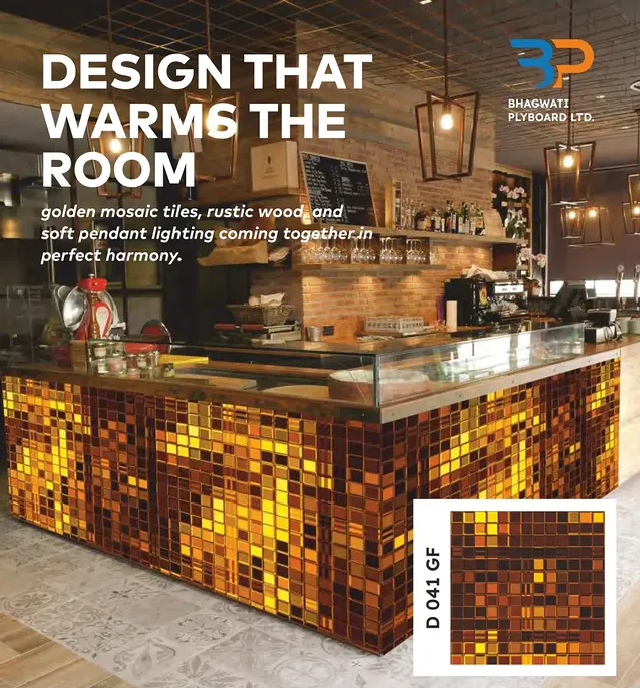 Warm tones and textured elegance come together in this striking bar setup, where mosaic tile designer laminate becomes the true centerpiece. The rich blend of golden hues reflects ambient lighting beautifully, creating a space that feels both inviting and sophisticated. Paired with rustic wood and soft pendant lights, the design transforms an everyday counter into a statement of style and warmth.